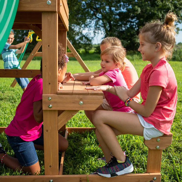 Transform your backyard into an exciting playground with the Backyard Discovery Belmont Swing Set. This versatile outdoor playset offers a fun way for kids to stay active and play while enjoying the fresh air. Designed with an elevated play deck and a durable canopy roof, it’s perfect for imaginative adventures while providing plenty of shade. Kids will love thrilling rides down the 8-foot wave slide or enjoy soaring on the two belt swings for sky-high adventures. Aspiring gymnasts can test their skills on the trapeze, while the rock wall ladder offers an exciting climb to the upper deck. When it’s time for a break, the shaded snack bar with an attached bench provides the perfect spot for treats or arts and crafts. Plus, the lower area can be transformed into a sandbox to inspire creative sensory play. Crafted from naturally durable cedar, this wooden swing set is built to last and boasts an inviting light brown finish that adds beautiful style. The ready-to-assemble design features pre-cut, pre-drilled, and pre-stained pieces, plus guided instructions with the interactive BILT® app for easier installation. The Belmont Swing Set by Backyard Discovery delivers a complete backyard playground where active play and imagination come together.
