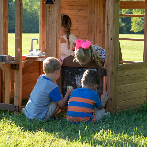 The fun never stops with the Bristol Point Swing Set by Backyard Discovery. This outdoor playset is designed with exciting play features that transform your backyard into an ultimate playground adventure. The charming clubhouse boasts inviting bay windows that flood the space with natural light, a wooden roof, two balconies, a playful steering wheel, and a chalkboard that’s perfect for creative drawing. Kids can peek through the toy telescope to scout their next mission before zooming down the spiral tube slide or racing down the 10-foot speedy wave slide. Little climbers will love scaling the rock wall with 12 climbing holds, while the flat step ladder provides easy accessibility to reach the clubhouse. The lower play space offers even more imaginative fun with an adorable half door and mounted chalkboard. Inside, a charming play kitchen comes alive with a toy sink, grill, and cookware set, allowing kids to whip up pretend meals and ring the dinner bell when it’s time to eat. Outdoor playtime continues with two classic belt swings and a trapeze for active fun. Crafted from natural cedar, this wooden swing set is built to last while the ready-to-assemble design and BILT® app instructions make setup a breeze.