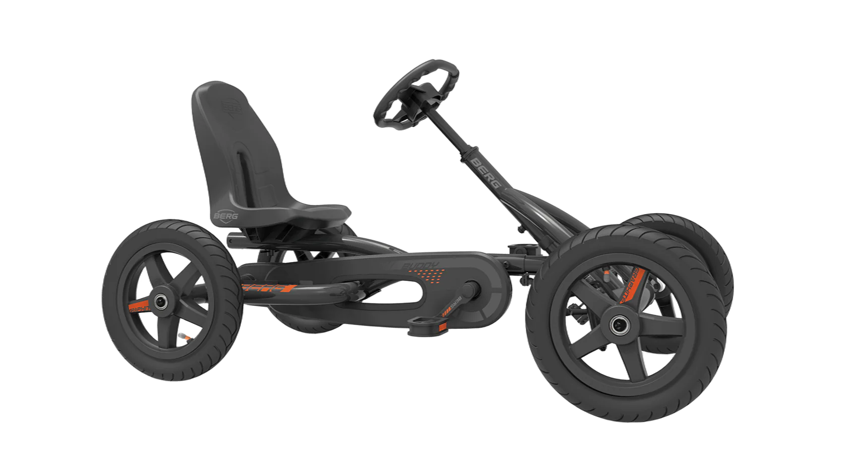 Make a splash in the neighborhood with the BERG Buddy Go-Kart. You will be sitting comfortably in the spacious bucket seat. The steering wheel has optimal grip and is already prepared for the BERG Soundbox! (Excludes Graphite and Grey models) Whichever version you choose… with the Buddy, you’ll certainly be the coolest driver on the street!