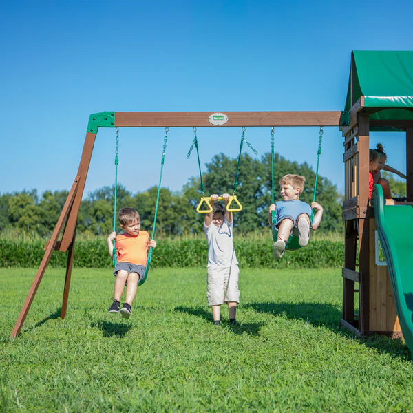 Crafted to maximize fun in smaller backyards, the Lakewood Swing Set by Backyard Discovery offers an exciting play area that will keep children entertained for hours. This inviting outdoor playset includes an elevated clubhouse, complete with colorful canopy roof and charming window to encourage creative adventures. The cozy lower playhouse features a full front door, snack bar window, and built-in bench seating, providing the perfect spot for restaurant games or a relaxing refreshment break. Kids can swing together on two classic belt swings and a thrilling trapeze bar, creating endless moments of laughter and fun. Designed with safety and durability in mind, this wooden swing set offers a perfect backyard playground where children can climb, swing, and explore. The wide rung flat step ladder provides easy access to the upper clubhouse, while the speedy 8-foot wave slide delivers exciting rides back to ground level. Crafted from naturally durable cedar wood that resists decay, this backyard swing set ensures years of outdoor play. Plus, the canopy roof offers added shade while maintaining excellent visibility for parents’ peace of mind. With ready-to-assemble design and guided instructions through the interactive BILT® app, the Lakewood Swing Set brings endless adventures to any sized yard.