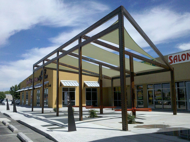 The RS-918 shade sail is manufactured in the USA using UV stabilized high density polyethylene (HDPE) shade fabric and UV stabilized sewing thread. Each corner is reinforced using multiple layers of shade cloth and a stainless steel d-ring. A pocket is sewn around the entire perimeter of the sail to house a tensioning wire rope (included) which is designed to help transfer the tensile load from the corner tensioning device (small turnbuckles or pulley kit included) to the center of the sail.