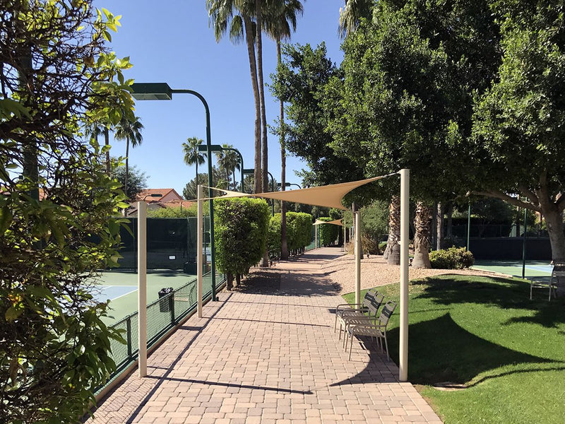 A square shaped shade sail approximately 12′ x 12′