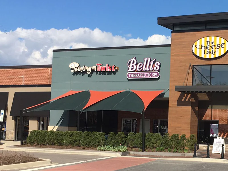An equilateral triangle shaped shade sail approximately 9′ x 9′ x 9′